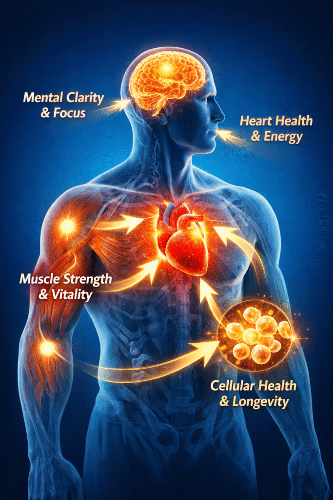 CoQ10 (Coenzyme Q10) – Supports cellular energy production, helping reduce fatigue, oxidative stress, and age-related decline in vitality.
